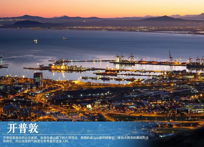 【開普敦】是歐裔白人在南非建立的第一座城市,這座南非白人心中的母城三百余年來數(shù)度易主,歷經(jīng)荷、英、德、法等歐洲諸國的統(tǒng)治及殖民,雖然地處非洲,但卻充滿多元?dú)W洲殖民地文化色彩。開普敦集歐洲和非洲人文、自然景觀特色于一身,因此名列世界最美麗的都市之一,也是南非最受歡迎的觀光都市。