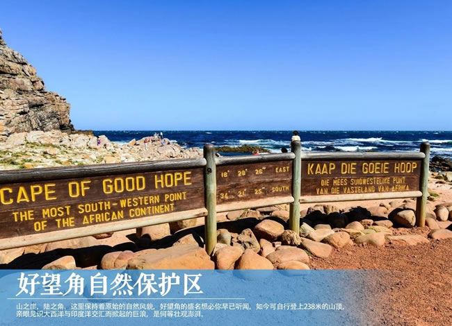 【好望角】于開普半島南端,在保護(hù)區(qū)內(nèi),鐵銹色凹凸不平的地面上生長(zhǎng)著一片片低矮的灌木叢和被稱為南非國花的山龍眼,狒狒、非洲旋角大羚羊等動(dòng)物間或在眼前一躍而過。在大西洋邊紅色的卵石灘上,時(shí)??梢婑匄B閑庭信步的可愛模樣。在保護(hù)區(qū)的西南端有一個(gè)如同伸入大西洋中巨大鱷魚爪的岬角。