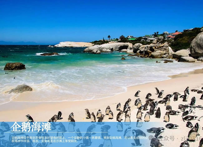 【企鵝海灘】走在木板搭建的長(zhǎng)廊上,深入到企鵝們棲息的海灘,近距離地觀賞企鵝。成群的企鵝在海灘邊上的海水中沖浪、戲水、覓食或是在沙灘上享受陽光。