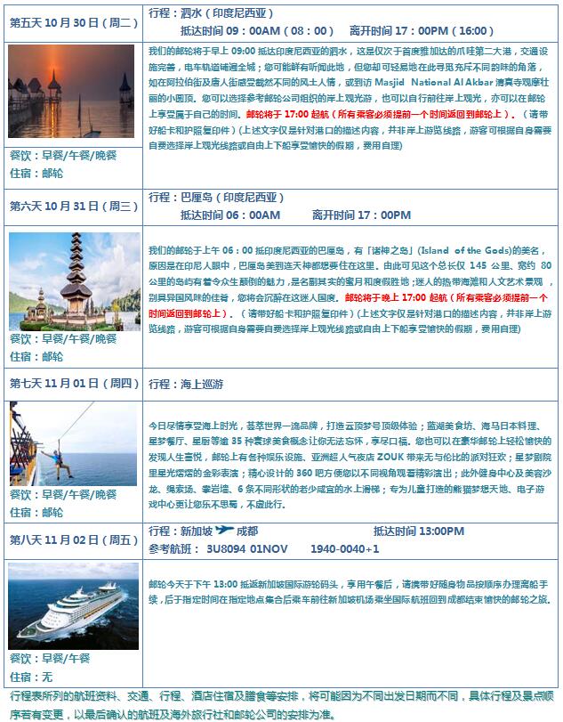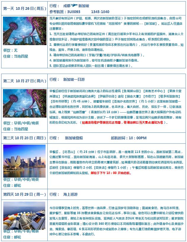 團(tuán)隊(duì)成都出發(fā)時間:2018年10月26日 郵輪當(dāng)?shù)貑⒑綍r間:10月28日