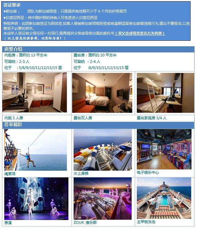 14、船上小費(fèi):星夢套房以下艙房為每人每晚21新幣;星夢套房(含)及以上房型每人每晚26新幣;2歲以下兒童免服務(wù)費(fèi);